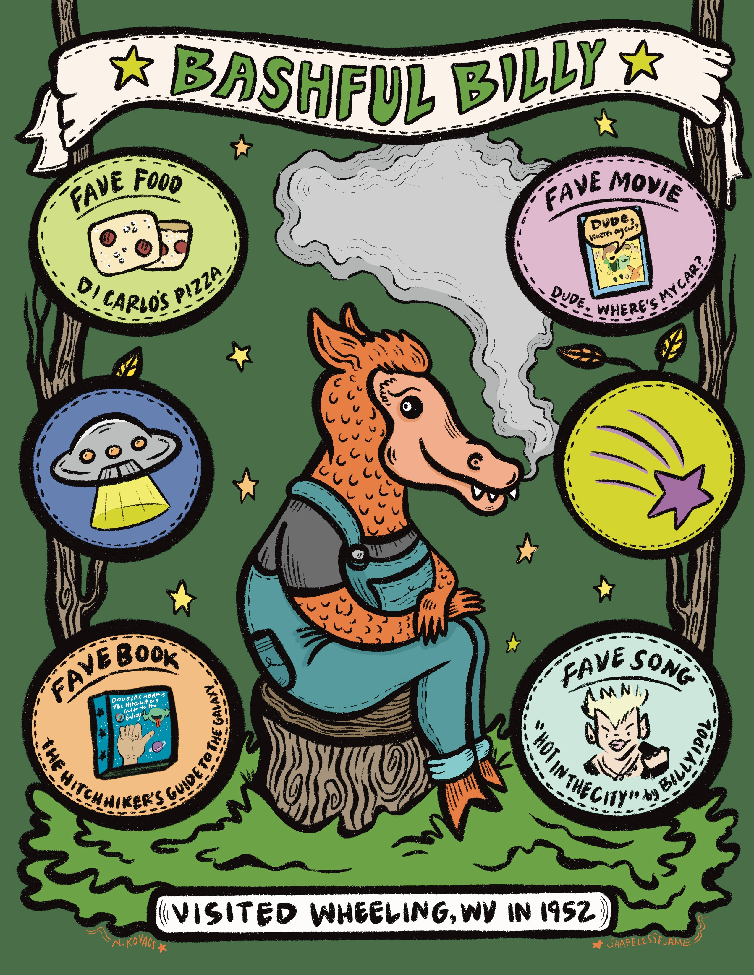 Locals claimed to see a bright light streaking across the sky followed by a supposed crash and sighting of a shy, fiery-mouthed creature later coined “Bashful Billy.”